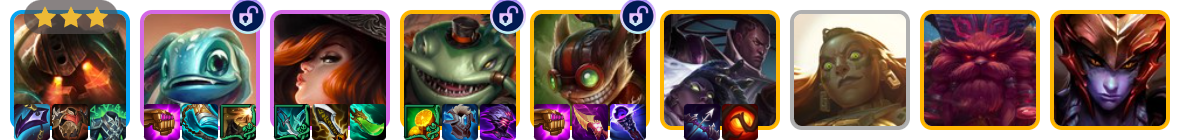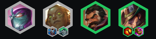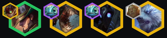 仅在强势连胜开局时玩。尽快冲7比尔吉沃特收集银蛇币,然后在后期降到5比尔吉沃特或3比尔吉沃特来换更高价值单位。别过分贪7比尔吉沃特的毕业装,你的胜利条件是压倒性的装备优势。崔斯特现在用来当主C,可以通过比尔吉沃特商店把他升到3星,或者9人口换成吉格斯